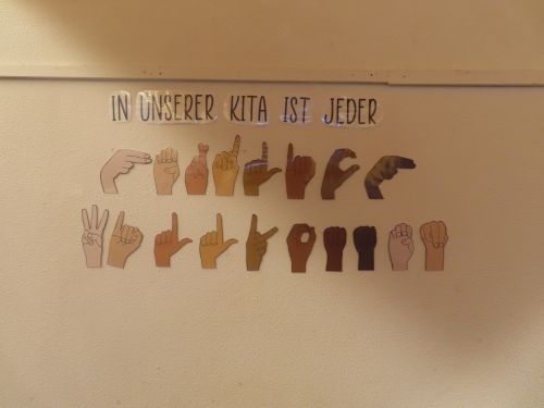 Schon wenn ihr bei uns ankommt, zeigen wir, dass bei uns wirklich alle willkommen sind – mit unserem Fingeralphabet am Eingang heißen wir jede Familie ganz herzlich willkommen.